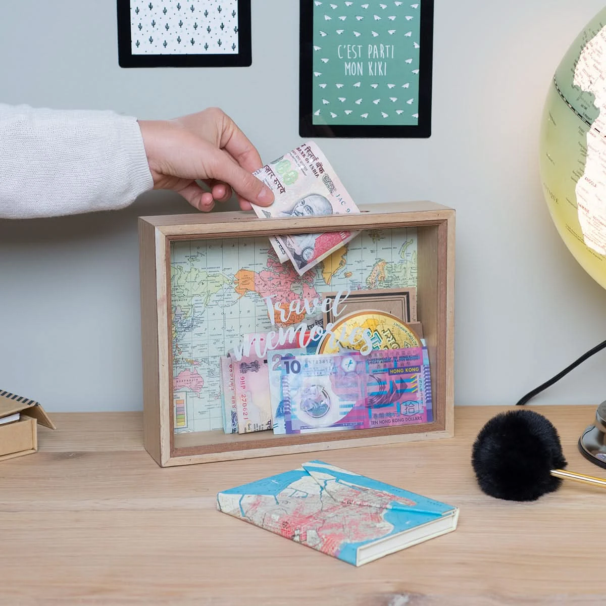 Cette boîte permet de prolonger votre voyage en conservant tous vos meilleurs souvenirs : billets de tramway, monnaies étrangères, entrées de musées, cartes de visite… Toutes ces choses dont vos poches sont pleines à votre retour de voyage et qui font que vos vacances ont été uniques. Glissez les simplement à travers la fente, comme dans une tirelire. La boîte à souvenirs est la meilleure façon de ne rien oublier ! Vous pourrez admirer tout ces souvenirs à travers la vitre transparente. Les photos avaient leur album… Désormais vos souvenirs ont leur boîte !