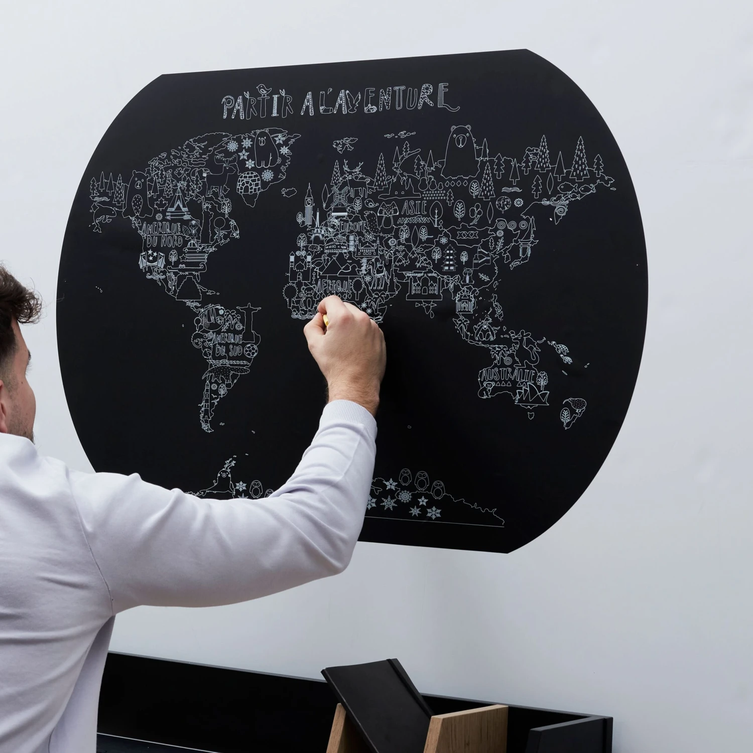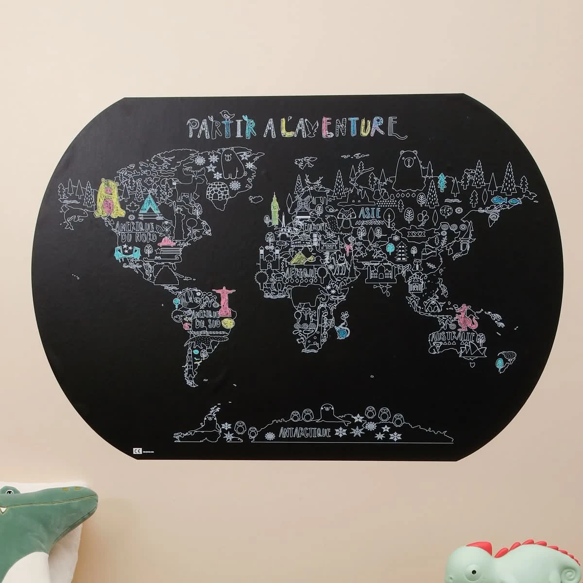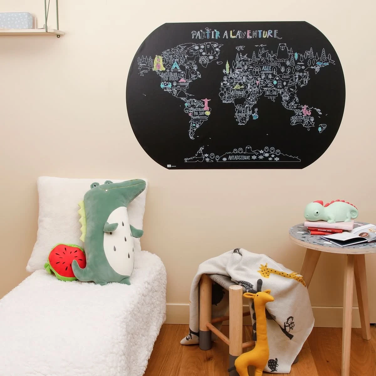 Vos enfants débordent d’imagination. Faites-leur découvrir le monde à travers cette carte à colorier à la craie. Ils pourront la coller au mur de leur chambre comme un grand poster. Dessiner, nettoyer, puis redessiner, ce n’est qu’un éternel recommencement en passant un simple coup d’éponge à l’eau savonneuse. Et oui, c’est du PVC ! On dit au revoir les feuilles de papier qui traînent et qui détruisent les forêts !