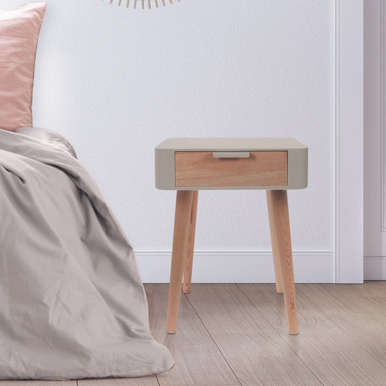 Vous avez des choses à cacher dans votre chambre ? Avec cette table de chevet, tous vos secrets seront bien gardés dans son tiroir… Son look en bois, et sa couleur taupe se marieront parfaitement avec une ambiance chaleureuse et bohème.