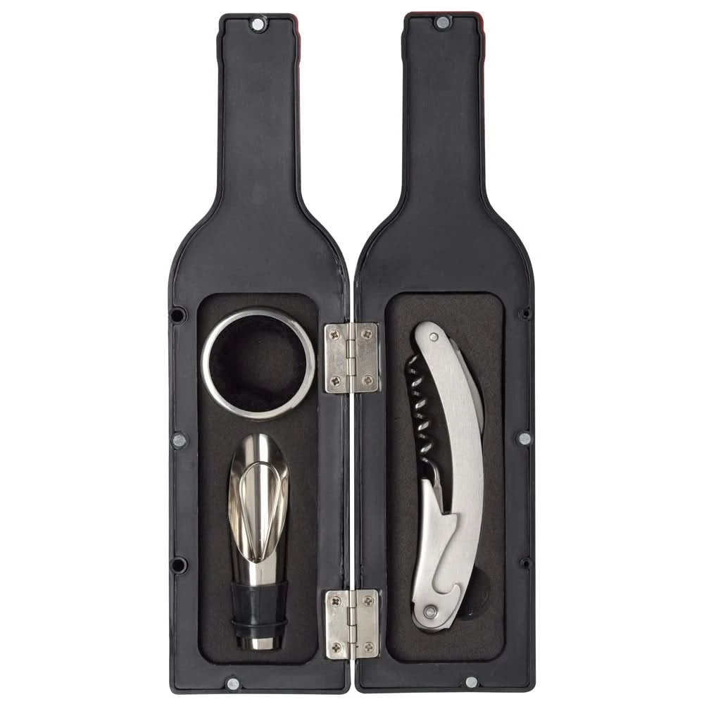 Avis aux amateurs de bonnes bouteilles ! Un kit d’accessoires à vin en forme de bouteille, il fallait y penser ! Cette petite bouteille contient 3 accessoires indispensables pour ouvrir et servir le vin dans les meilleures conditions. Original et design, cet accessoire est la bonne idée cadeau pour les amateurs de vin ! Décoratif, pratique et très peu encombrant, il peut facilement se ranger à l’intérieur d’un placard ou être laissé sorti en évidence sur une étagère et fera forcément plaisir.