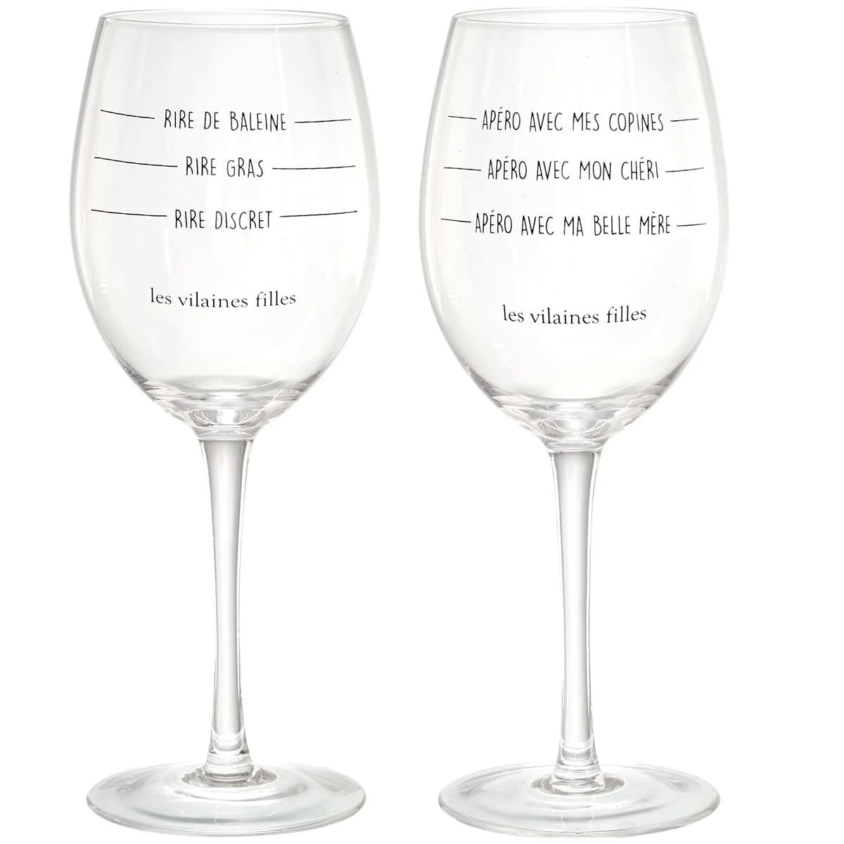 Boire un peu, beaucoup, jusqu’où ? Les Vilaines Filles ont bien du mal à doser leur quantité d’alcool. Pour se repérer, elles suivent le guide sur ce coffret de 2 verres à vin : rire discret, rire gras, rire de baleine. À vous de remplir le verre selon vos besoins. Et si vous dépassez ? Désolé, on n’y pourra plus rien !