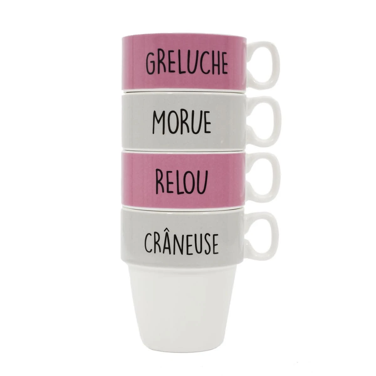 Votre meilleure amie, vous l’aimez à la folie. Noël est l’occasion rêvée de lui faire votre déclaration d’amitié. Vous avez devant vous le cadeau parfait, celui dont elle ne pourra plus se passer : le coffret de 4 tasses à café. Greluche, morue, relou et crâneuse pour des mots doux chaque matin au petit déjeuner.