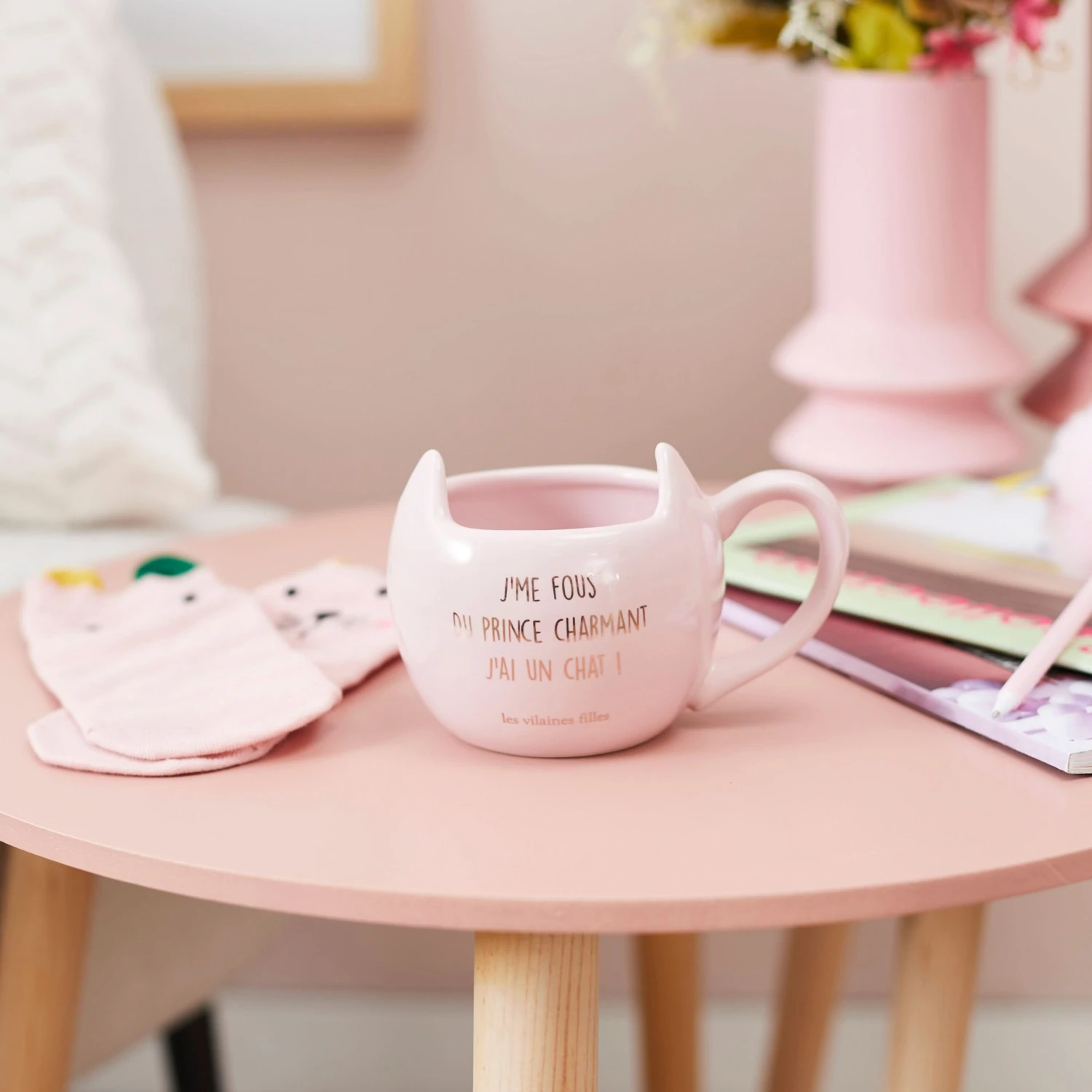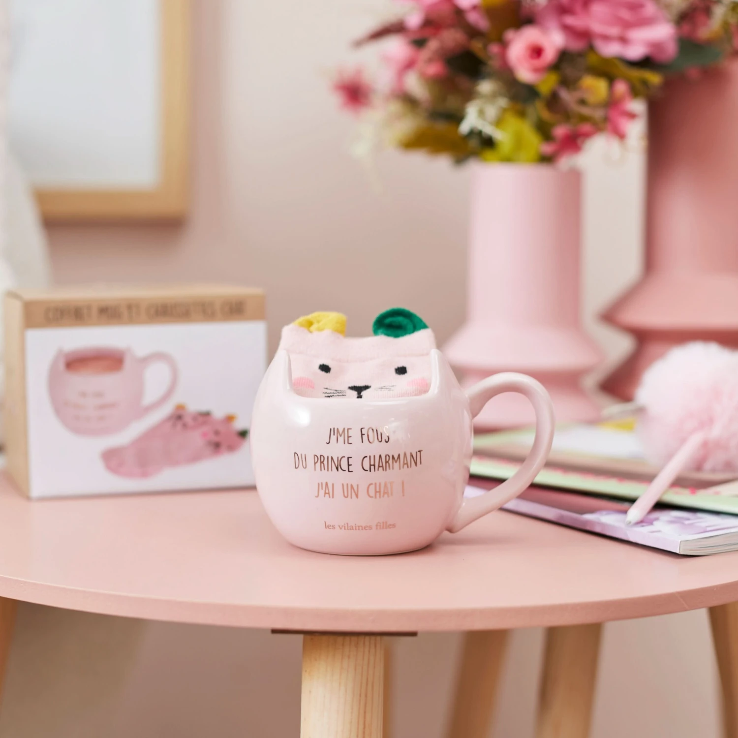 Ă quoi bon courir aprĂšs un homme, puisque vous avez un chat ! Une tisane relaxante, des chaussettes bien chaudes et vous voilĂ en charmante compagnie, en train de profiter des petites choses de la vie. Le coffret mug et chaussettes chat est Ă sortir Ă chaque petite envie. Quand on sait en plus que le prince charmant nâexiste pas !