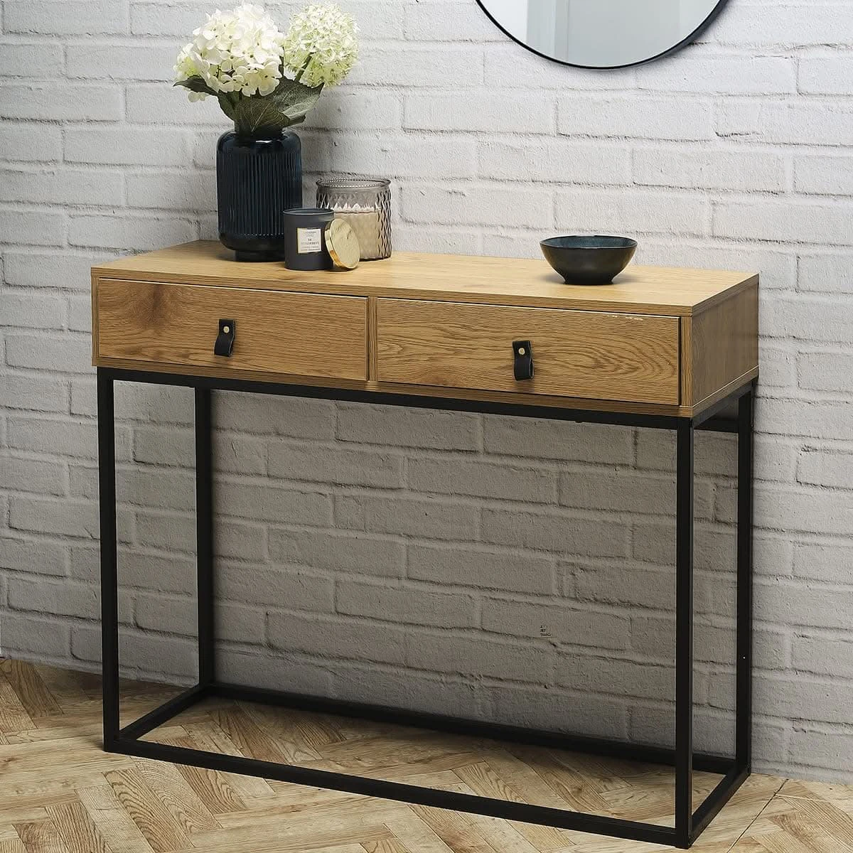 Dans votre entrée ou votre salon, exposez vos plus beaux moments en famille sur cette console design et pratique. Avec ses deux tiroirs, vous pourrez également y ranger votre double des clés, votre sac de course, ou encore votre parapluie… Le look bois et métal de la console fera un effet whaouh dans votre intérieur!