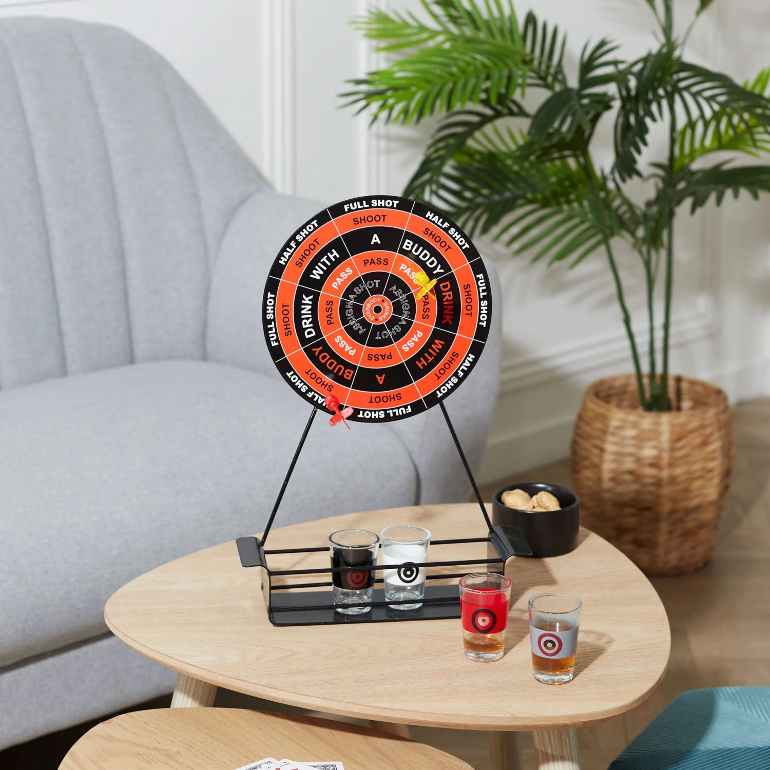 Ce jeu de flèchettes devrait vous motiver pour bien viser : atteignez le centre de la cible et c’est la tournée générale ! Chaque zone de la cible correspond à un gage : boire un demi-verre, un verre entier, boire avec un ami… Jouez avec modération… l’abus d’alcool est dangereux pour la santé.