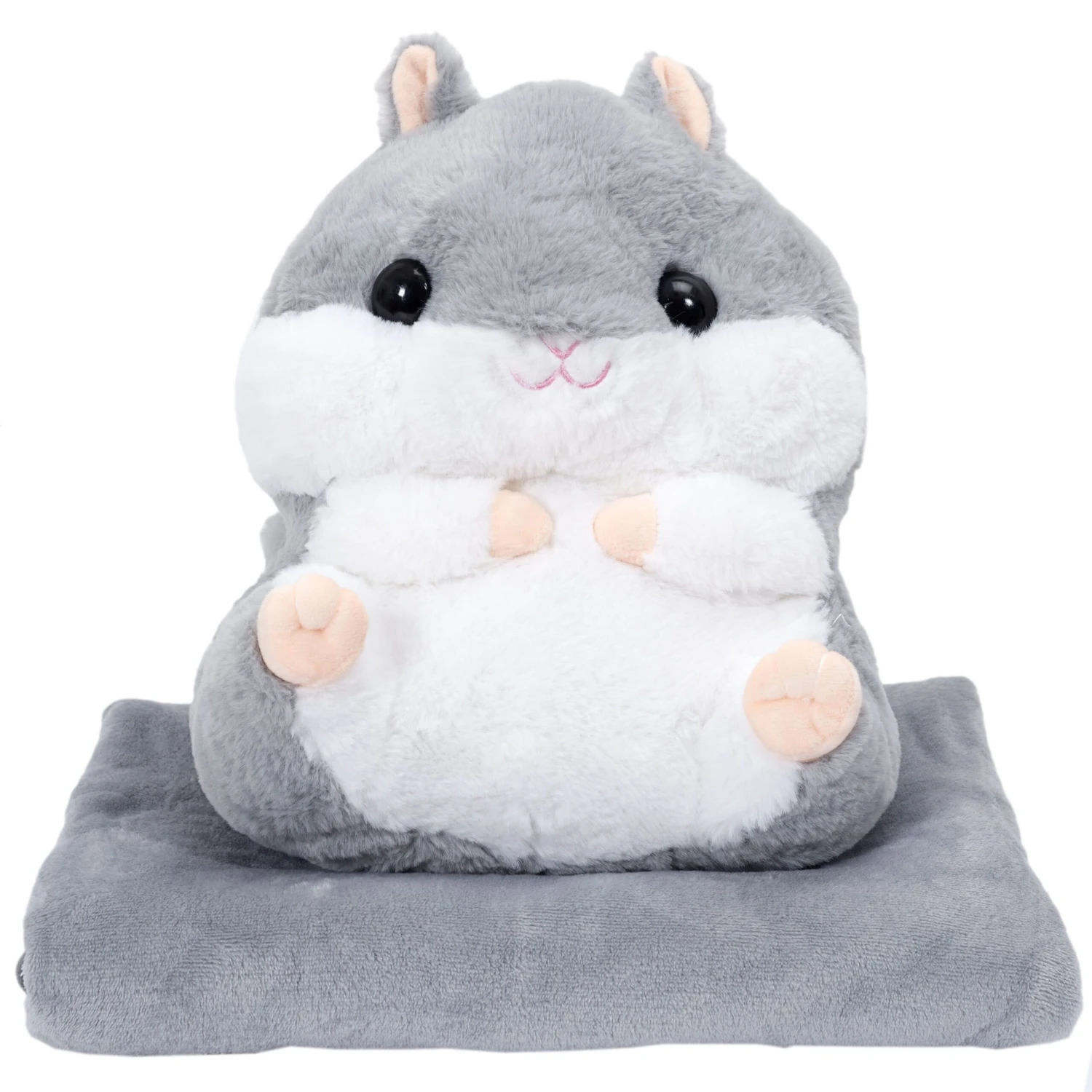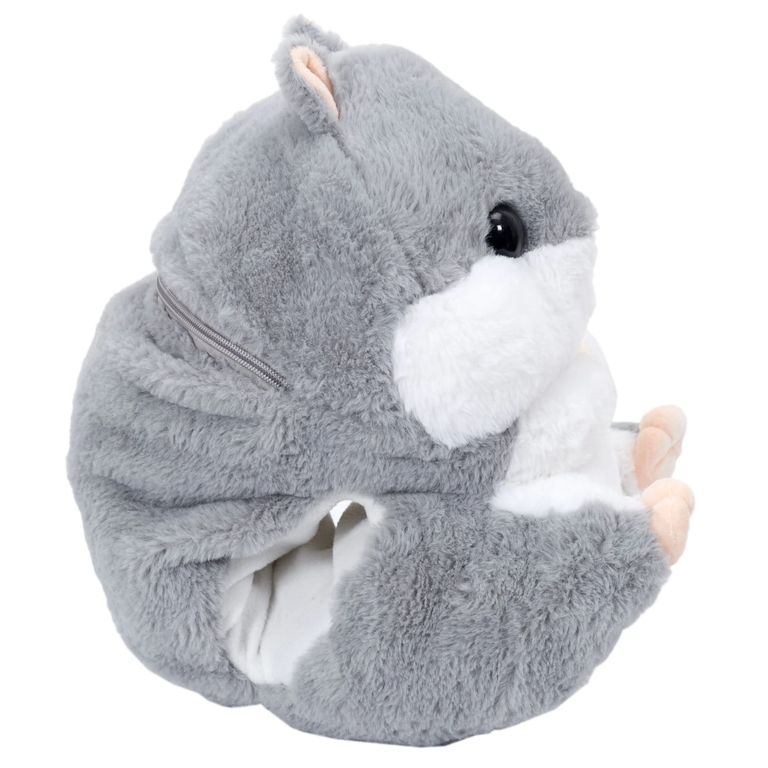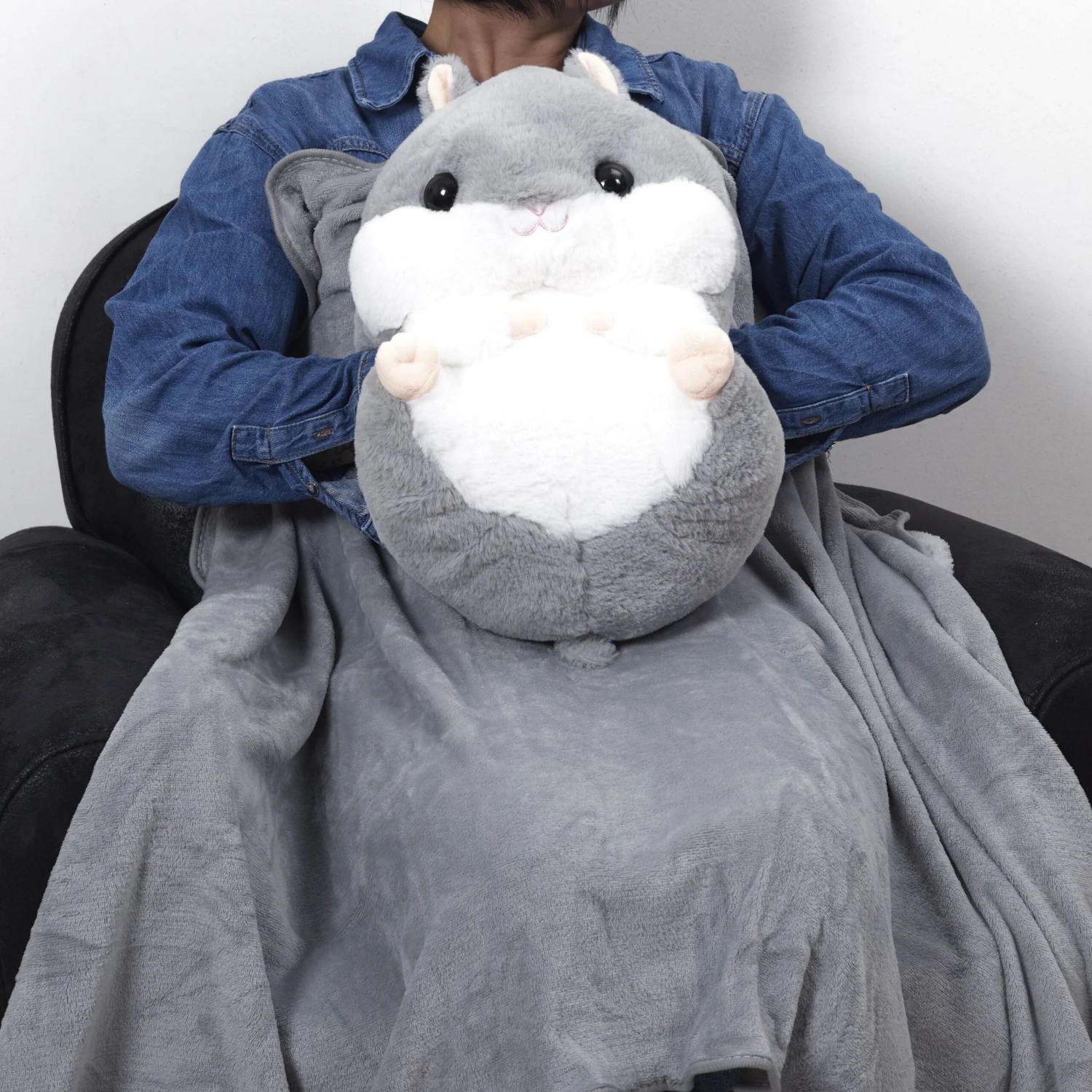 Sortez le plaid de la pochette au dos de votre hamster, installez vous confortablement dans votre canapé, et placez vos mains dans le manchon pour les tenir au chaud.
