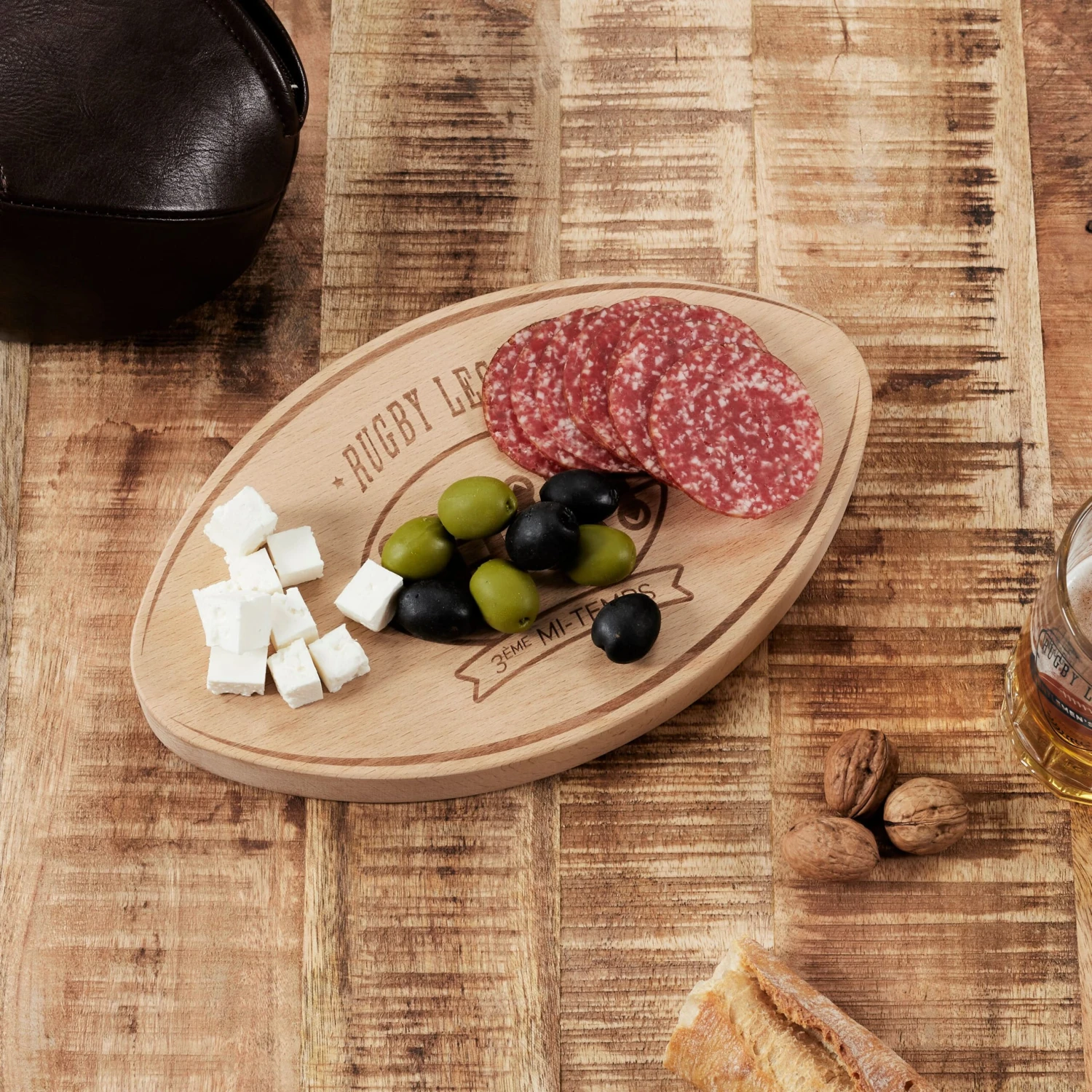 Amateurs de rugby et fins gourmets, découvrez la planche Apéro spéciale 3ème mi-temps en forme de ballon de rugby ! C’est bien plus qu’une simple planche, c’est une véritable ode à la gourmandise et à l’esprit sportif. Que vous soyez joueur sur le terrain ou spectateur dans les gradins, cette planche vous fera vibrer de plaisir ! Elle est parfaite pour les soirées matchs entre potes, les barbecues entre rugbymen et même les goûters d’après-midi en famille. Vous pouvez également l’offrir à vos amis supporters en cadeau, pour qu’ils puissent marquer des essais de convivialité à chaque rassemblement. Alors, préparez-vous à faire des passes décisives de gourmandise avec cette planche hors du commun !