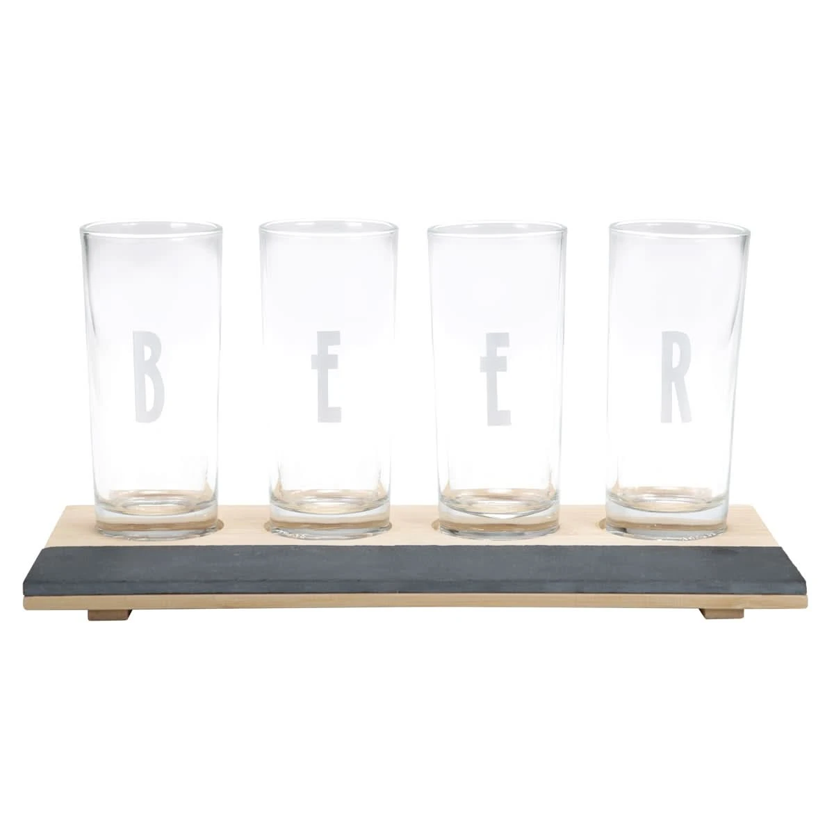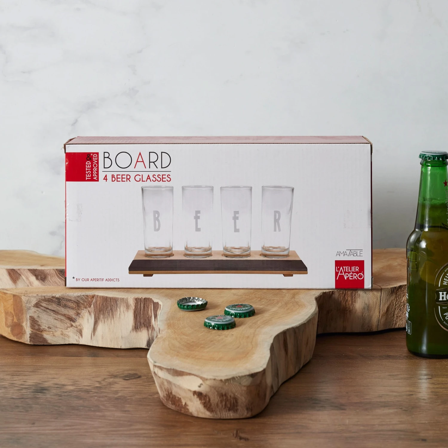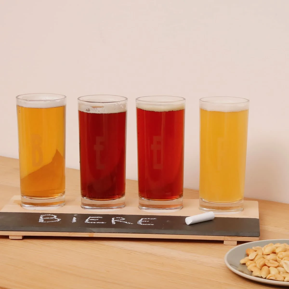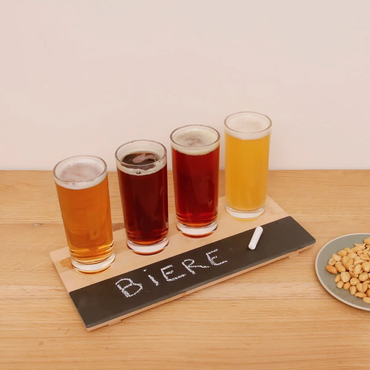 - Contient : 4 verres de dégustation, 1 planche de présentation en bambou avec 1 ardoise et 2 craies pour noter les noms des bières