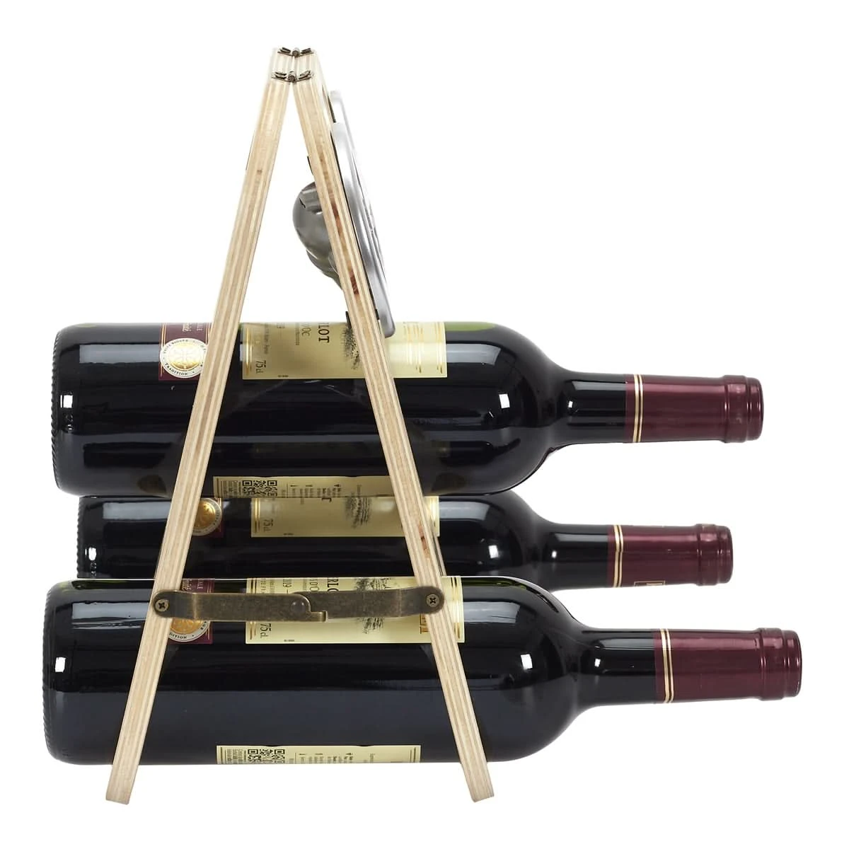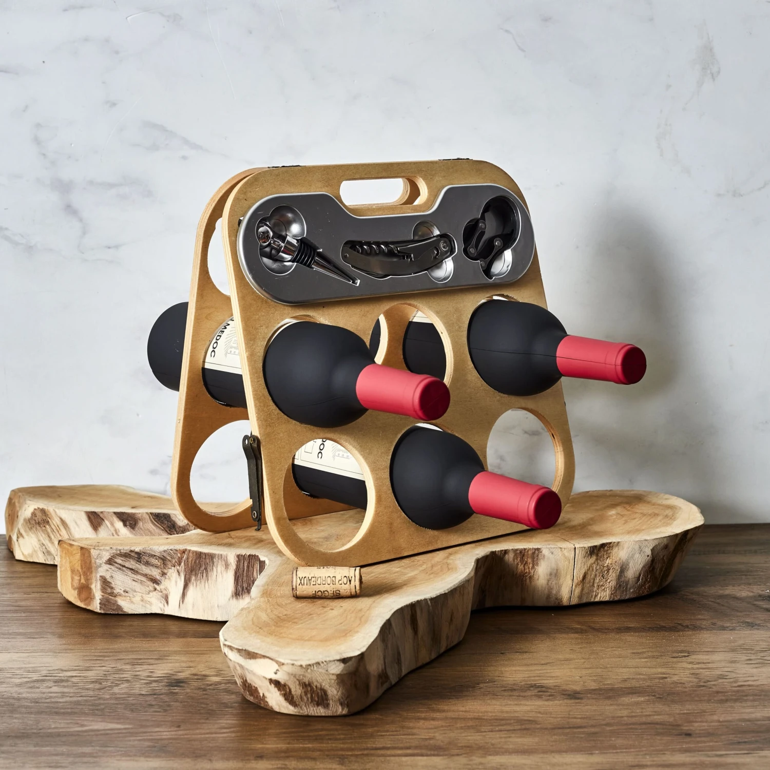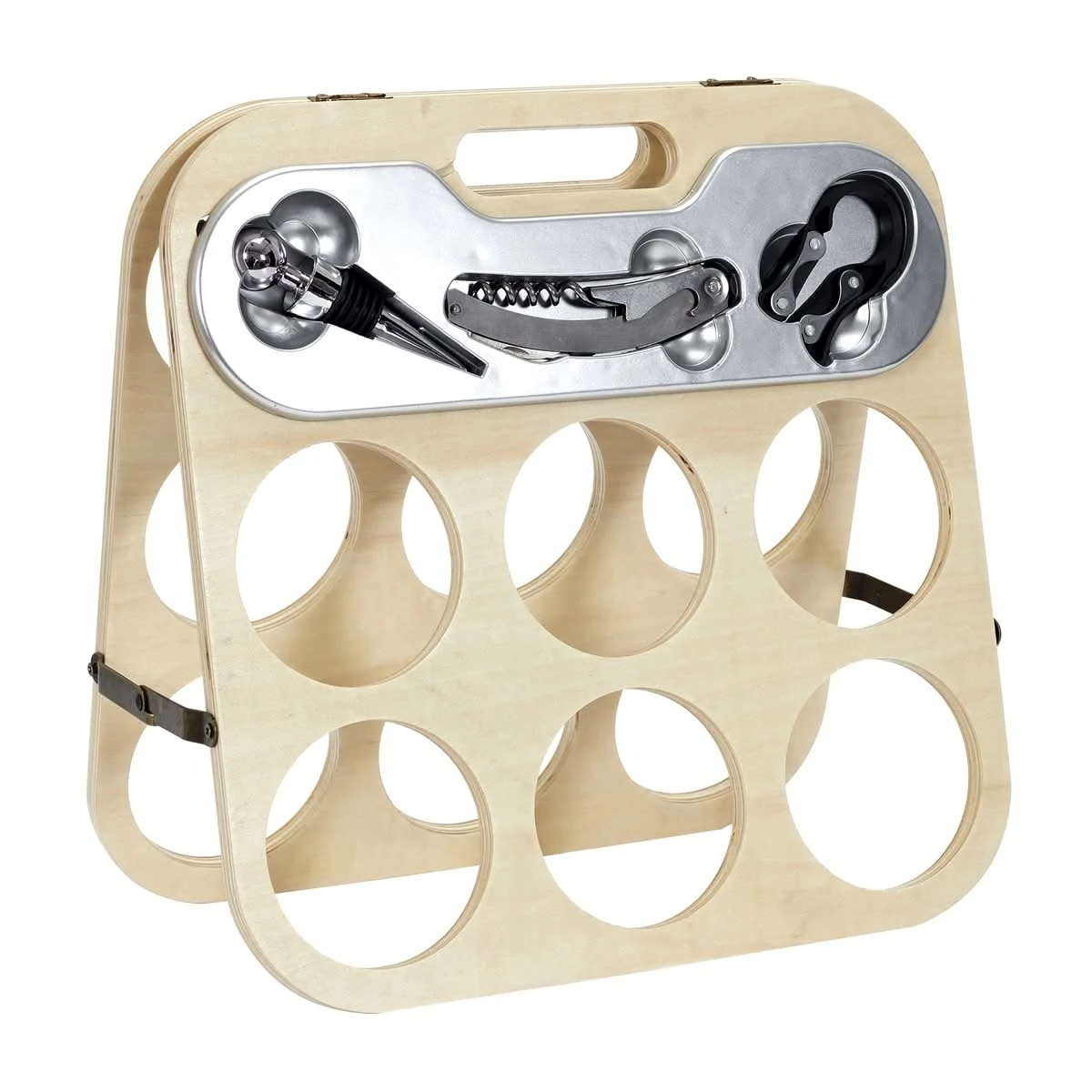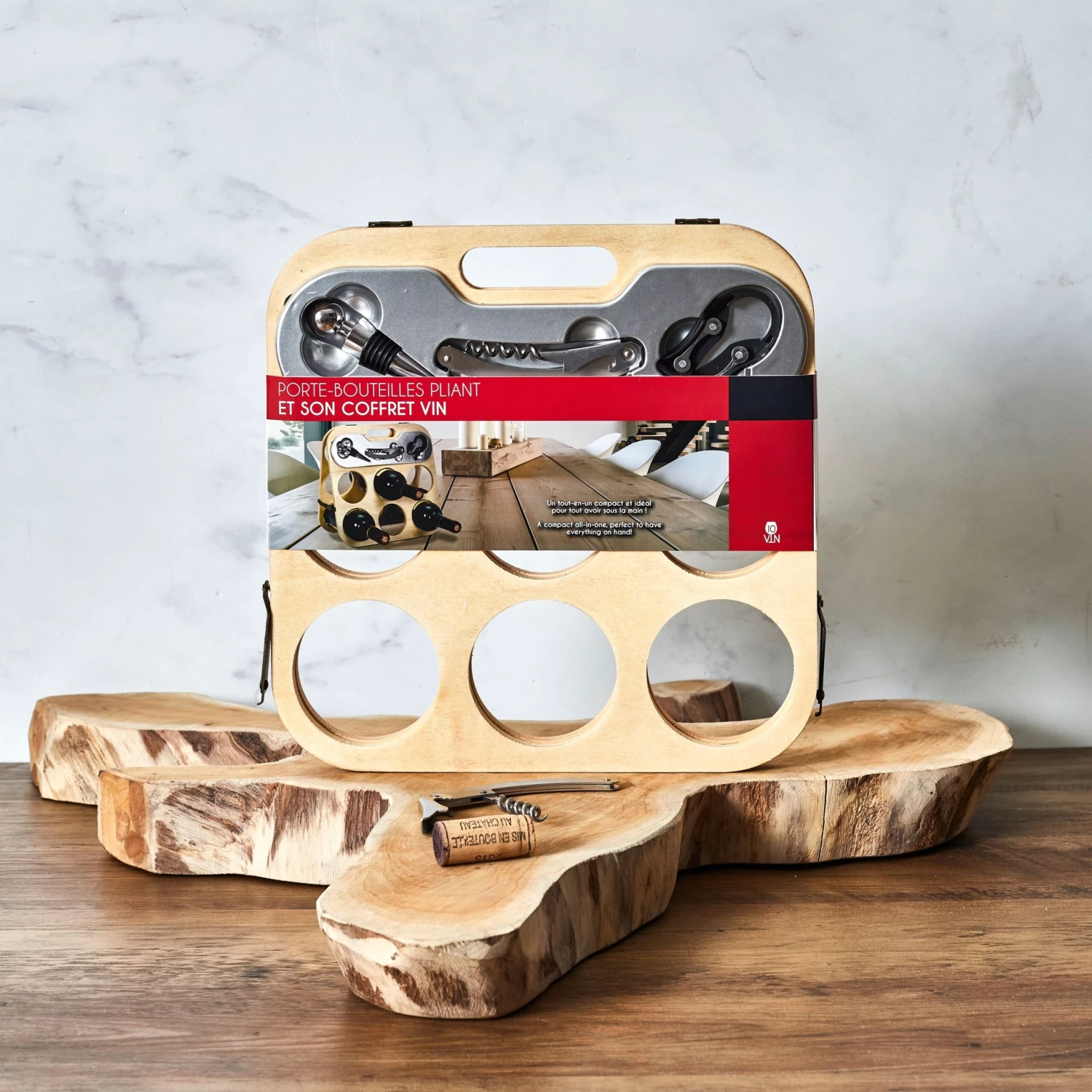 Voilà un cadeau sympa à offrir à un amateur de vin. Ce porte-bouteille pliant en bois comporte 6 emplacements pour une conservation à l’horizontale. Il est équipé d’un bouchon, d’un limonadier et d’un coupe-capsule intégrés dans la structure pour avoir tout sous la main le moment venu.