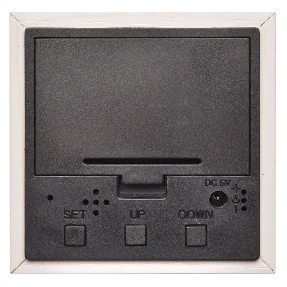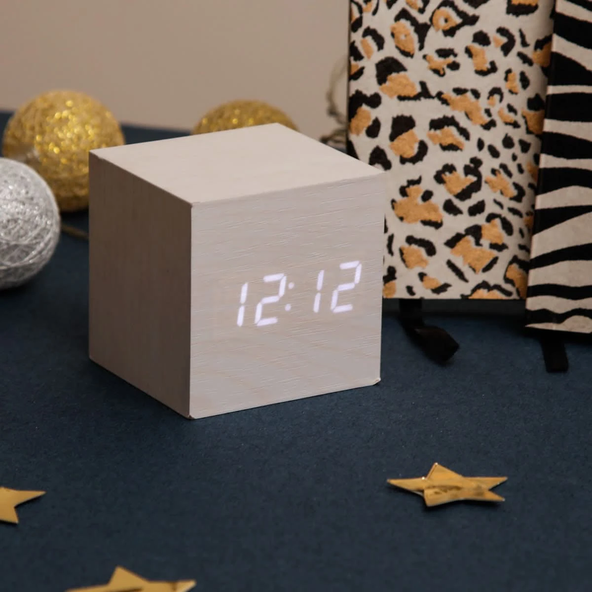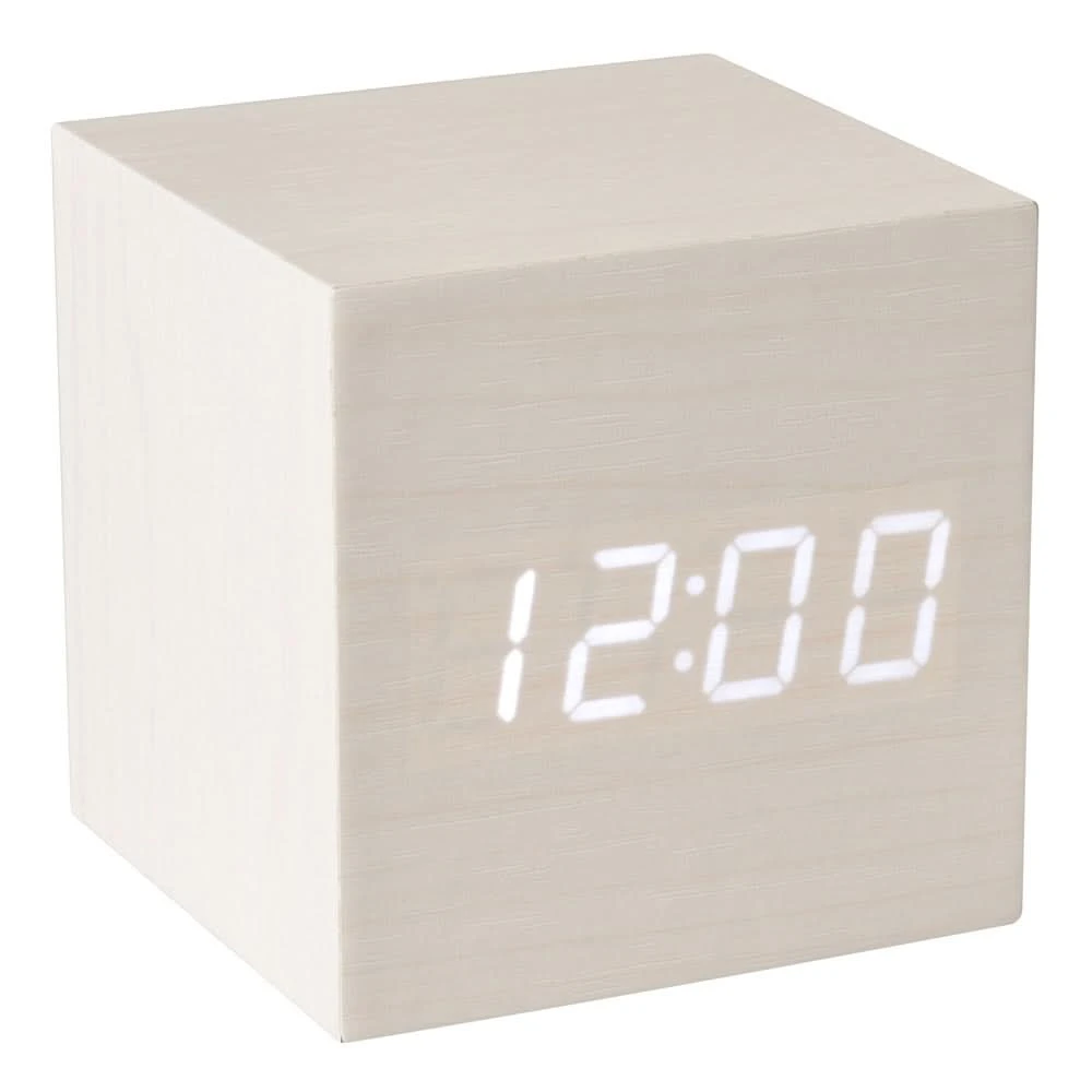 Ce cube en bois lasuré blanc dissimule un réveil à affichage lumineux.