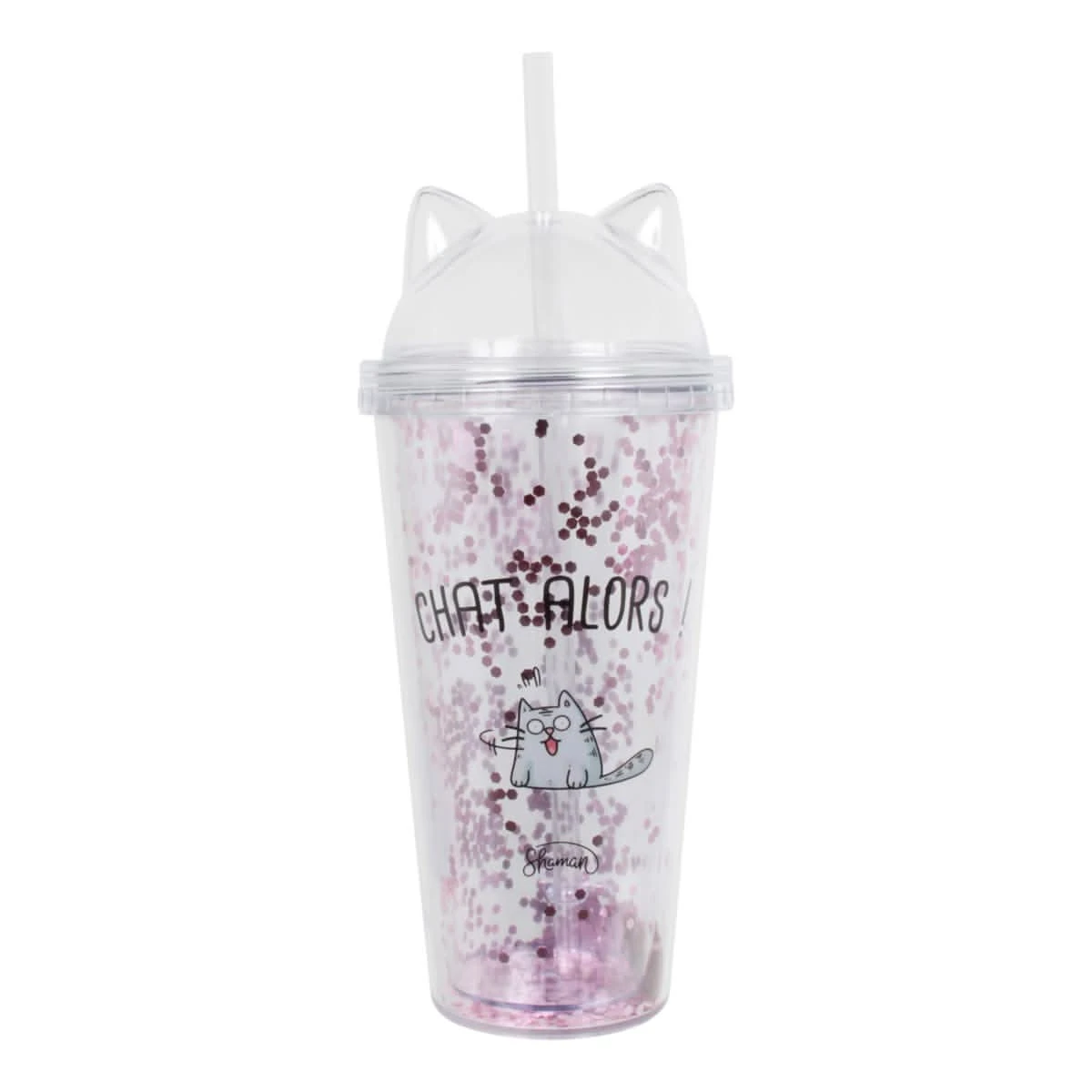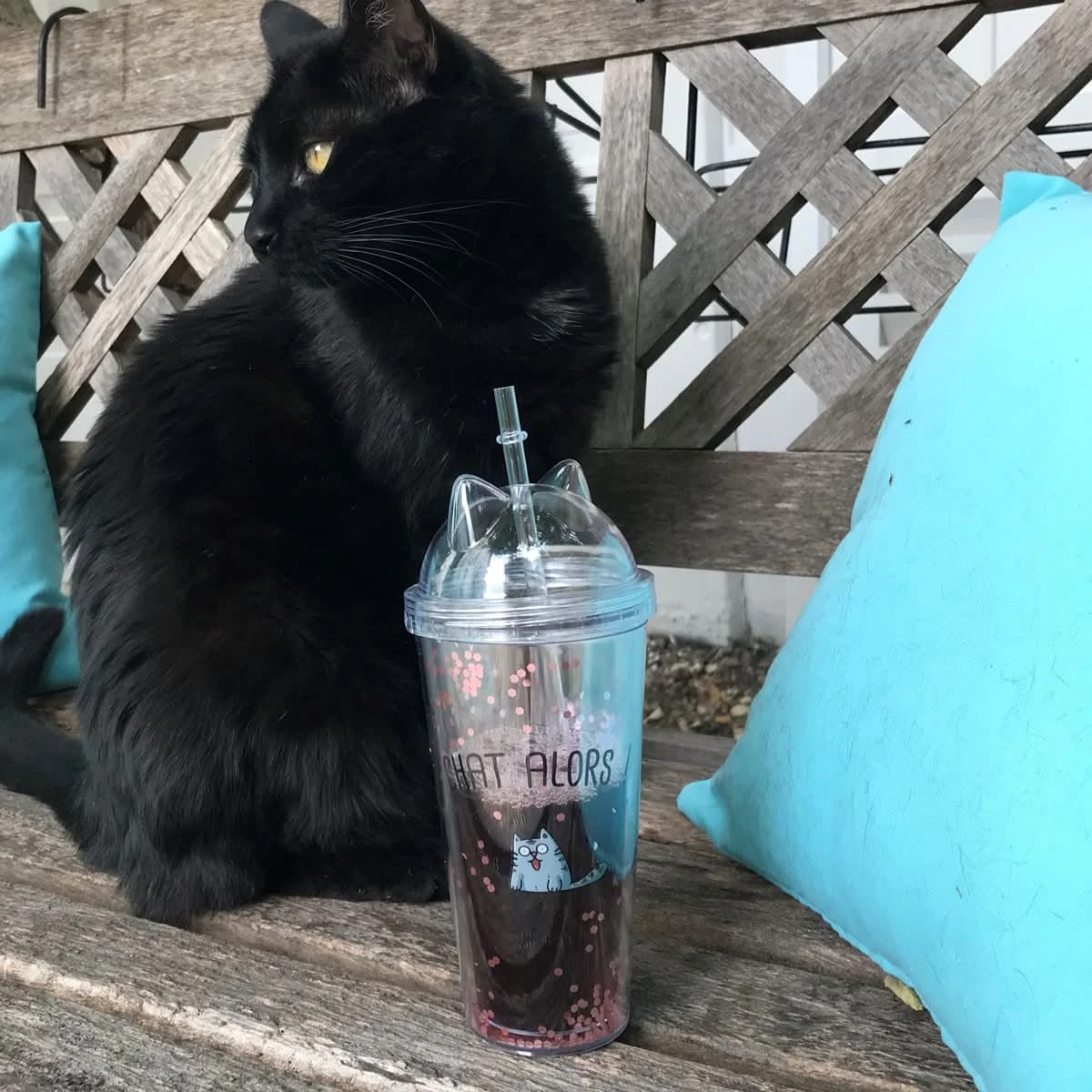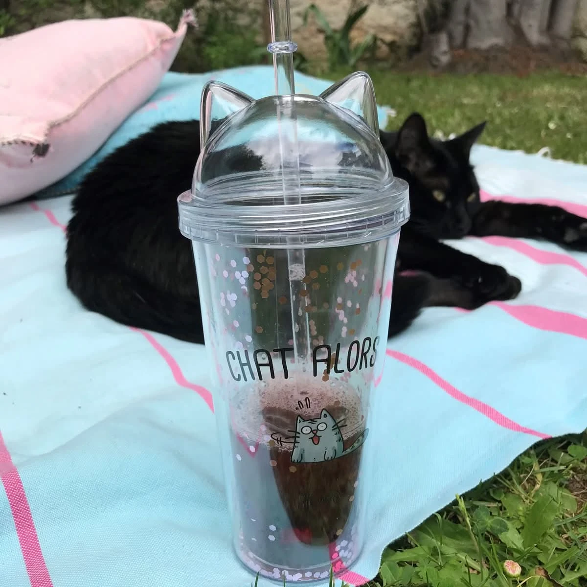 Si vous voyez tout tourbillonner, c’est normal ! Ce sont toutes les paillettes violettes dissimulées dans votre verre paille Chat alors. Apparemment, lui aussi n’en peut plus dès que vous levez le coude. Allez-y quand même avec modération, il ne faudrait pas que l’on vous retrouve par terre.